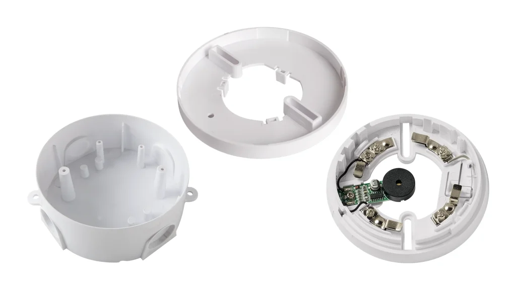 Il distanziatore EB0050 è progettato per essere installato sotto la base EB0010, sollevandola di circa 10 mm. Questa soluzione consente un’installazione pratica e ordinata, permettendo l’ingresso dei cavi a vista senza compromettere la funzionalità e la sicurezza del sistema di rivelazione incendio.