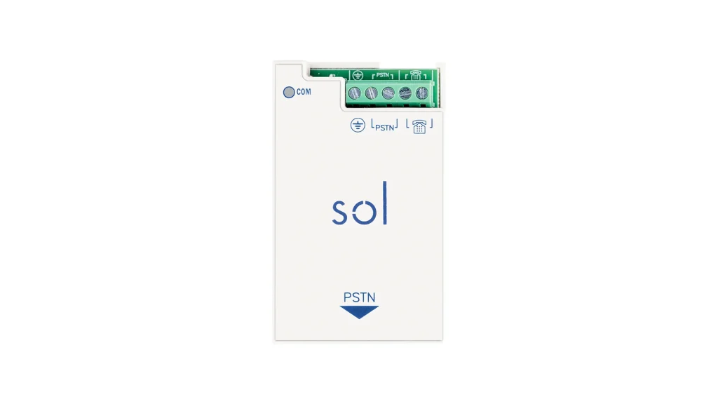 Il modulo opzionale Sol-PSTN consente di collegare la linea telefonica PSTN alla centrale, abilitando funzionalità fondamentali come il comunicatore vocale, il risponditore automatico e la televigilanza. Nel caso in cui la centrale non sia dotata di scheda vocale SmartLogos30M, su chiamata vocale viene riprodotto un beep continuo per 30 secondi.