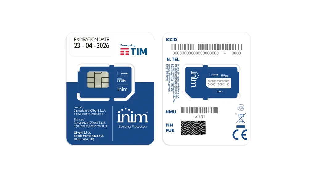 I-SIM Connectivity Service è il servizio di connettività per impianti antifurto che sfrutta la I-SIM100, una SIM card fornita da TIM/Olivetti, l’operatore mobile con la maggiore copertura rete in Italia. Grazie alla I-SIM100, i dispositivi Inim possono usufruire di servizi di connettività, avviso vocale ed SMS. La I-SIM100 è compatibile con tutti i dispositivi Inim abilitati ed è disponibile nel formato Standard, dal quale si può ricavare il formato Mini.